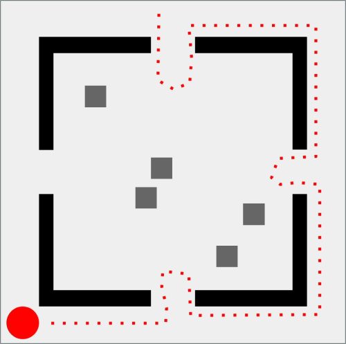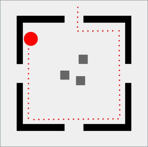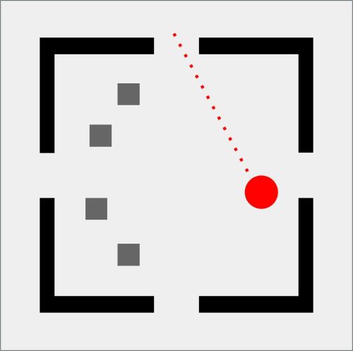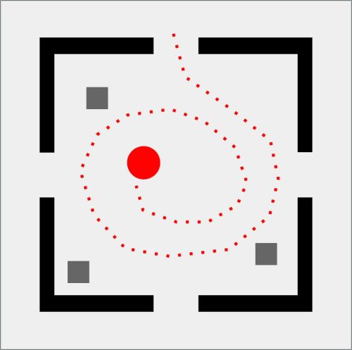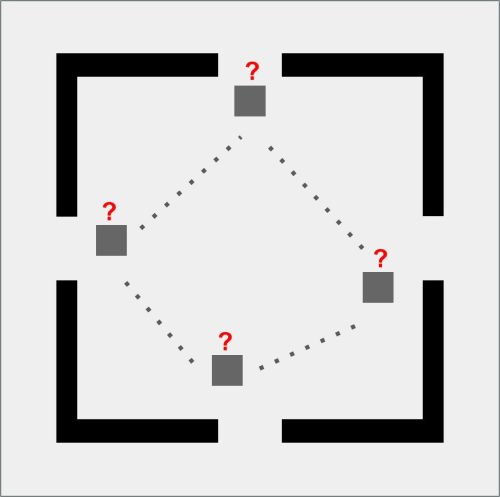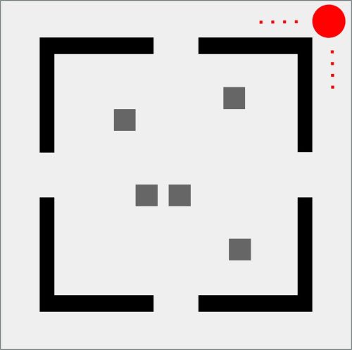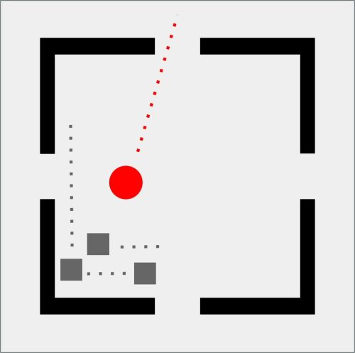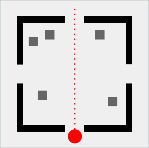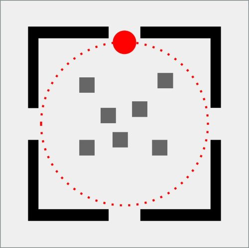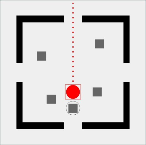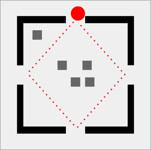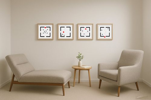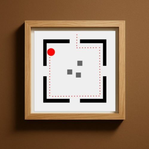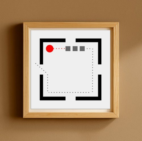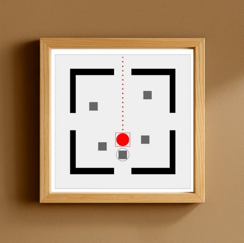 Da qui nasce GEOMETRIE SOCIALI, una collezione che osserva e disegna i comportamenti umani come se fossero mappe in miniatura. Il pallino rosso è l’individuo, fragile o spavaldo, sempre in movimento. Attorno a lui gli astanti, quadratini grigi che diventano la massa con cui misurarsi, da cui fuggire o a cui aderire. Ogni scena è una piccola “mappa comportamentale”: un atlante prossemico che mette in figura l’invisibile logica sociale dei nostri corpi quando occupano uno spazio. La stanza, con i suoi quattro ingressi, è insieme gabbia e possibilità.